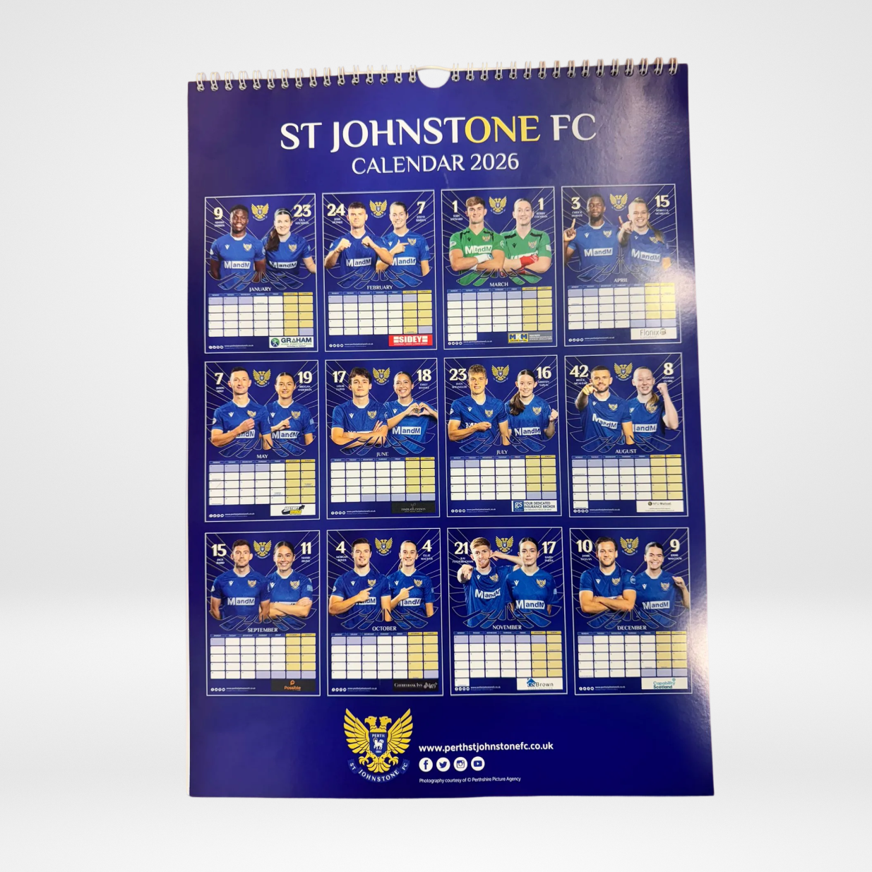 The SJFC Official 2026 Calendar features a full year of player photography, with each month showcasing one men’s team player and one women’s team player. Printed on high-quality stock with a clean monthly layout, it offers a simple and practical way to keep organised while celebrating St Johnstone throughout the year. A great addition to any home or office for supporters looking to follow the club across all 12 months.
