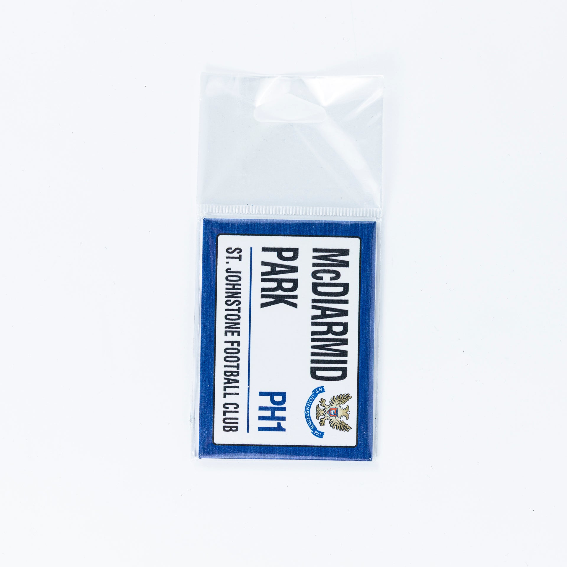 The SJFC Metal Fridge Magnet features a McDiarmid Park street-sign design in a compact, durable format. Made from lightweight metal with a strong magnetic backing, it includes the St Johnstone FC crest, PH1 postcode detail, and bold club lettering. Ideal for adding a touch of Saints pride to your fridge, freezer, or any metal surface.