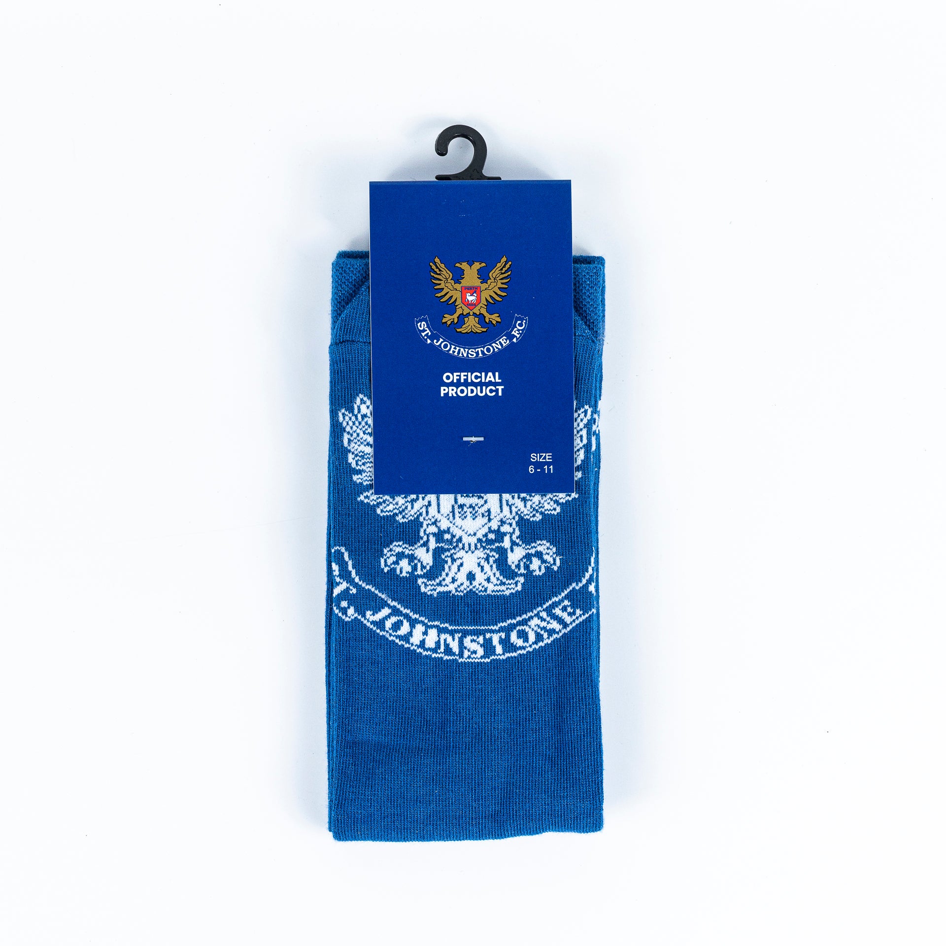 The St Johnstone Sock features a classic royal blue design with the club name and crest woven into the fabric. Made from a soft, comfortable material blend, it offers a snug fit suitable for everyday wear. The detailed crest near the foot adds a subtle but distinctive Saints touch, making these socks a simple way to show club pride.